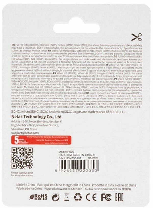Карта памяти Netac P600 Sdhc 32Gb Сlass 10 (nt02p600stn-032g-r) Nt02p600stn-032g-r .