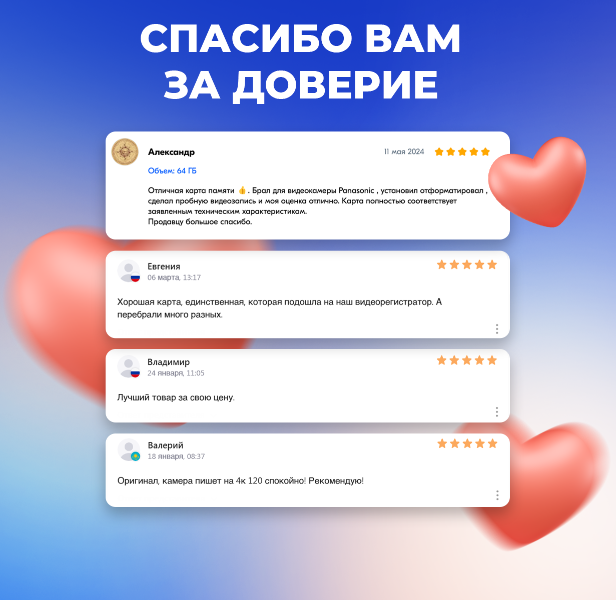 | Отзыв: | Использую для записи видео в Panasonic HC-V 760 (1080 50p), взял изза цены, мне достались 3 карты по 32 гб за 600 рублей, итого 200 р за карточку 32. До них пользовался картой памяти Sony, на моем оборудовании разницы не заметил. Смело можно брать. |