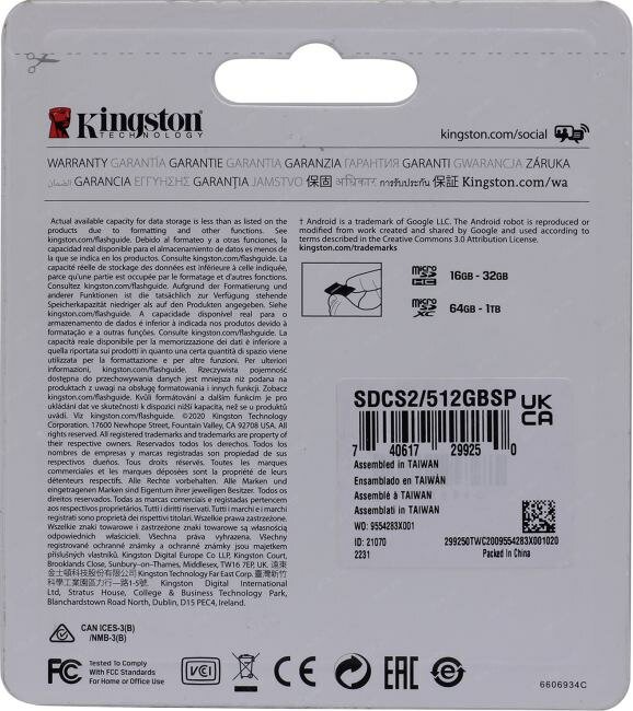 Карта памяти MicroSD 512Гб Kingston SDCS2/512GB