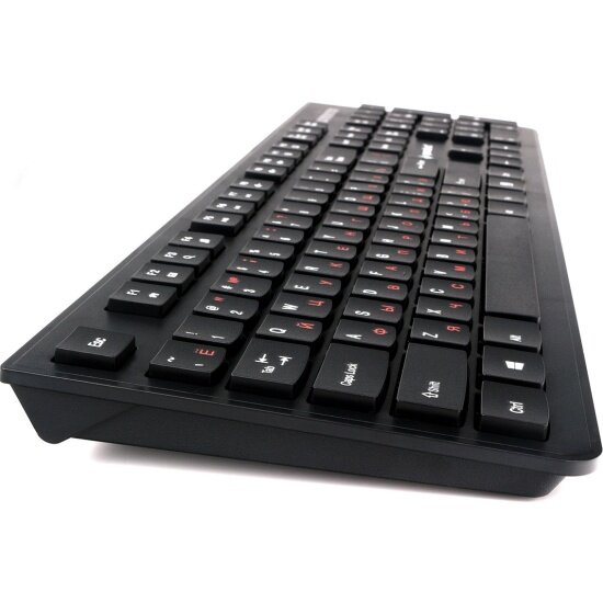 Корпус клавиатуры сделан добротно, без люфтов. При работе и перемещении нет ощущения, что она сейчас согнется или сломается, как на некоторых бюджетных вариантах. Верхняя поверхность корпуса, кроме ранта и поверхность кнопок, слегка шероховатые - очень приятной фактуры. Прорезиненных вставок на ножках нет, но за счет конструкции и веса клавиатура остается практически неподвижной при работе, в отличие от других вариантов, которые просто ездят по столу при печати. Шрифт английского языка белый, русского - красный. Оба читаются четко, даже при относительно слабом освещении. Индикаторные огни видны четко. Мышь простой но удобной формы, в руке лежит комфортно. Нажатия клавиш четкие, колесо работает тихо, плавно. Ход мыши ровный - курсор откликается адекватно. В отличие от совсем бюджетных вариантов у мыши есть тефлоновые "ножки". |