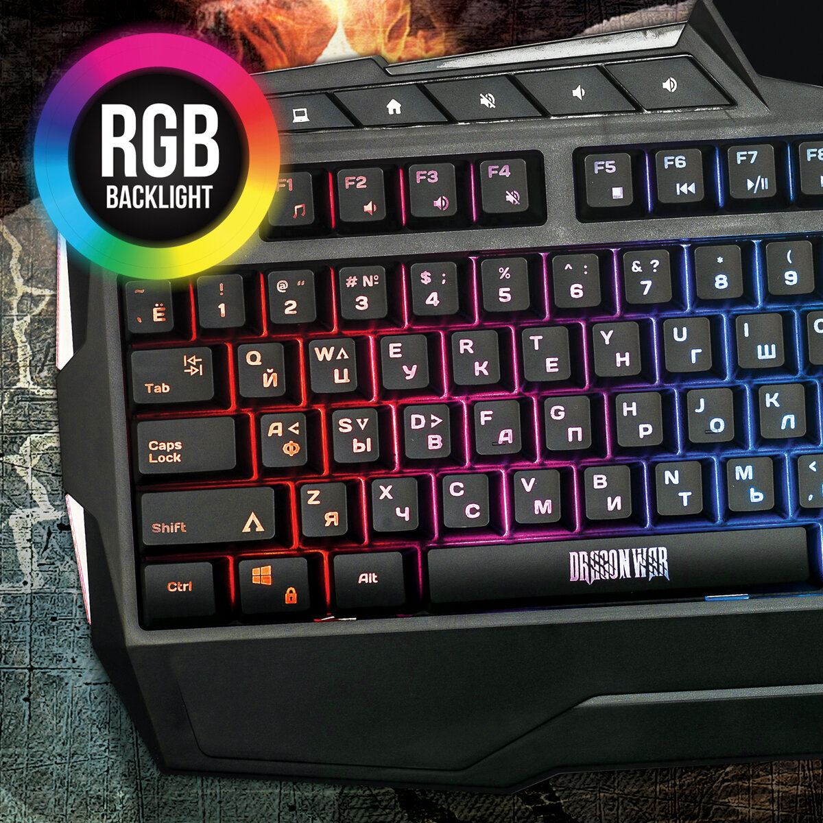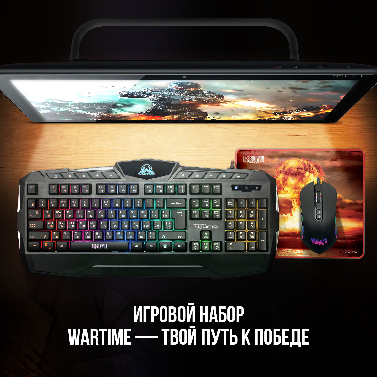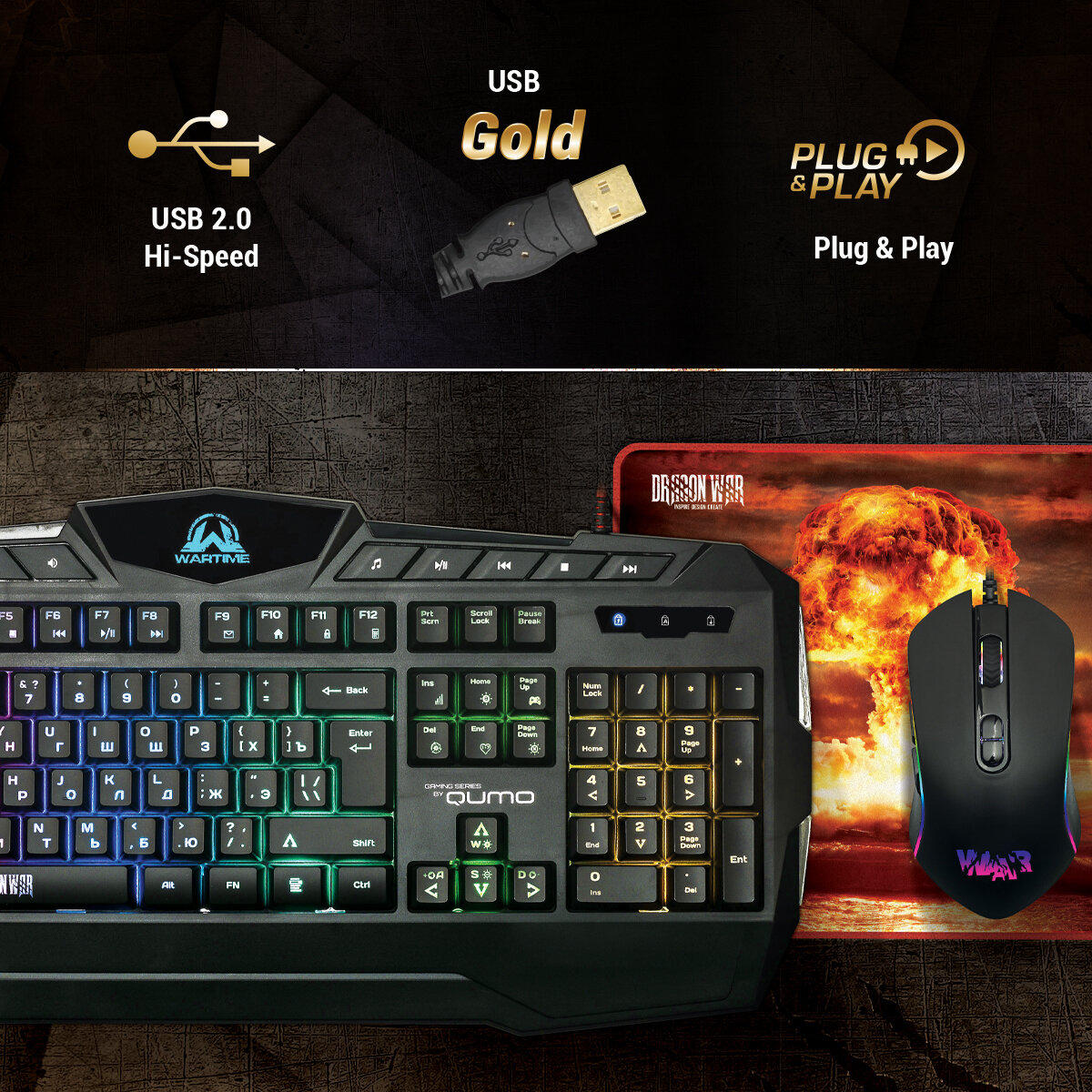 Игровая клавиатура Qumo Wartime + мышь (проводная оптическая) + коврик , комплект игровой с RGB подсветкой