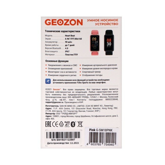 Geozon Фитнес-браслет Geozon Heart Beat G-SM18PNK, 0.96", TFT, шагомер, пульсометр, 90мАч, розовый