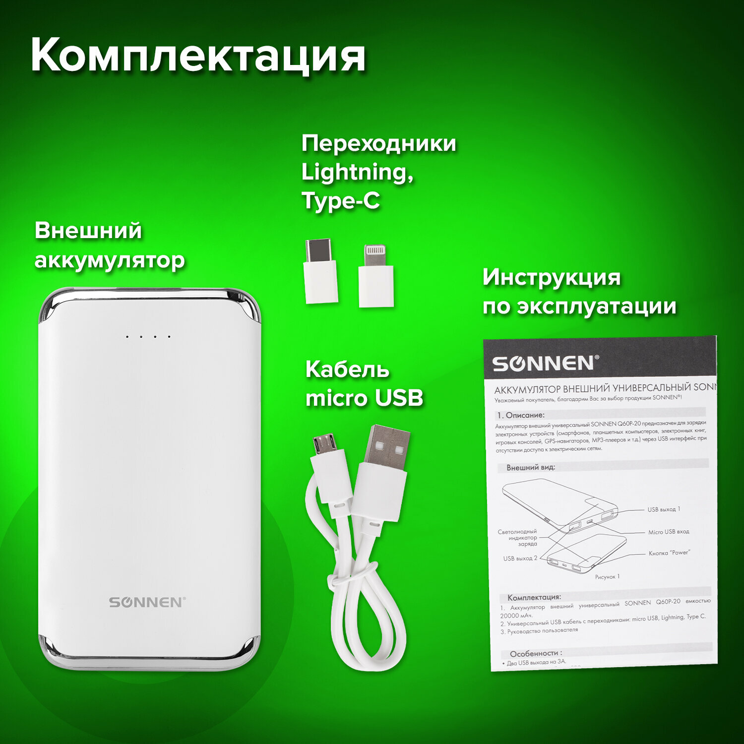 SENNBEYER power bank 30000 мАч, солнечная батарея, с кабелем и экраном.