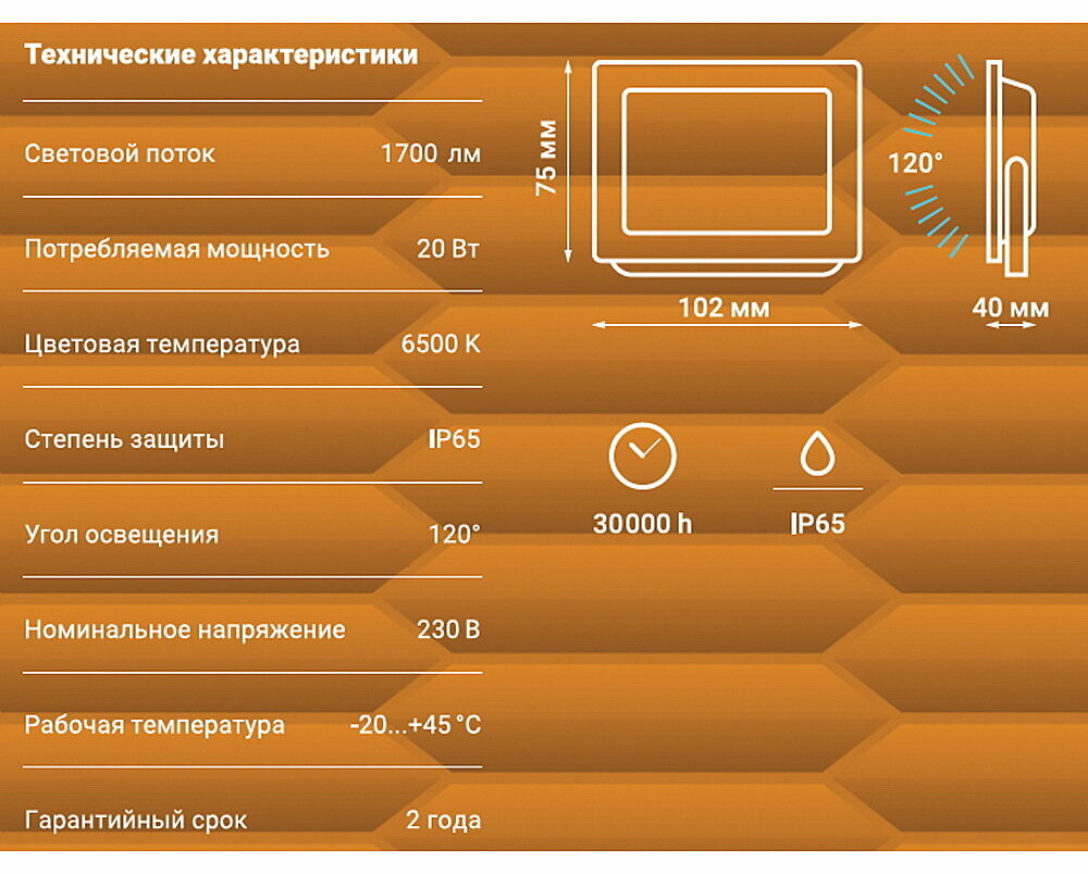 Прожектор светодиодный 20 Вт, 6500 К, 1600 Лм, IP65