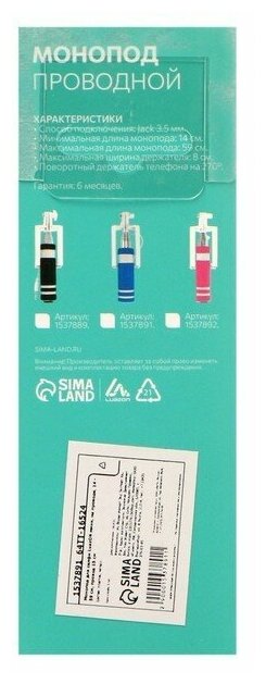 Luazon Home Монопод для селфи LuazON мини, на проводе, 14 - 59 см, провод 15 см, синий