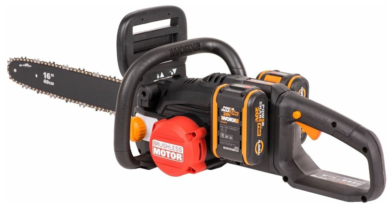 Аккумуляторная цепная пила Worx Nitro WG385E, бесщеточная 40В, 40 см, 2 АКБ по 4 Ач, ЗУ 2А