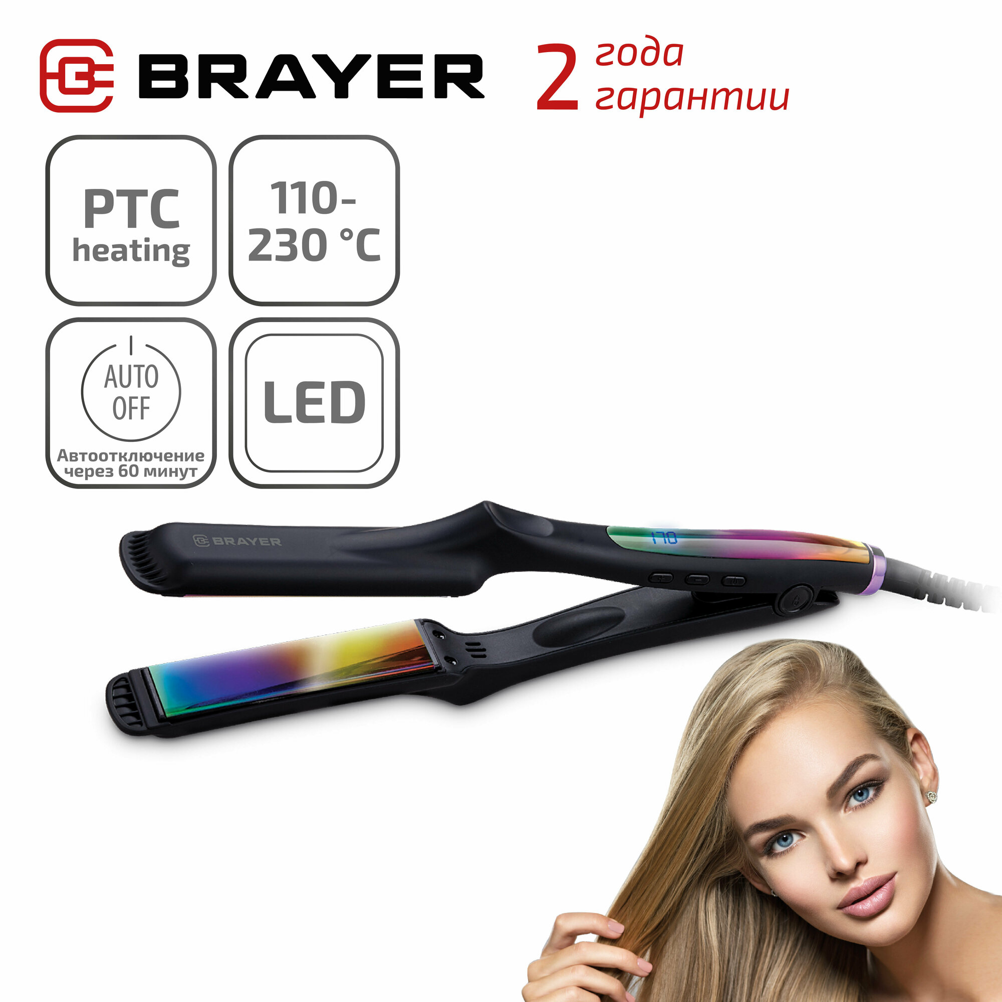 Выпрямитель BRAYER BR3332, 50 Вт, керамическое покрытие, 7 режимов, Led-дисплей, PTC Heating - быстрый нагрев, автоотключ, шнур 1,8 м, черный
