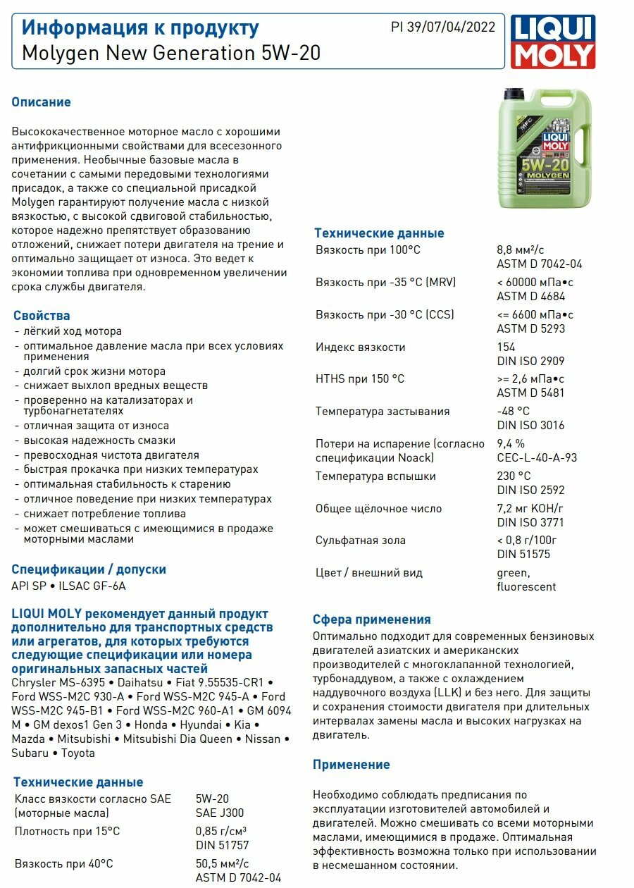 Liqui moly 5w-20 Molygen New Generation Sp 5л (Нс-Синт.Мотор.Масло)