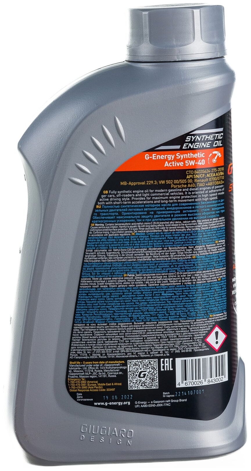 G-Energy Synthetic Active 5W-40 5л синт. мотор. масло SN/CF, A3/B4, VW 502.00/505.00, Renault RN0700/0710, MB 229.3, ПАО "автоваз"