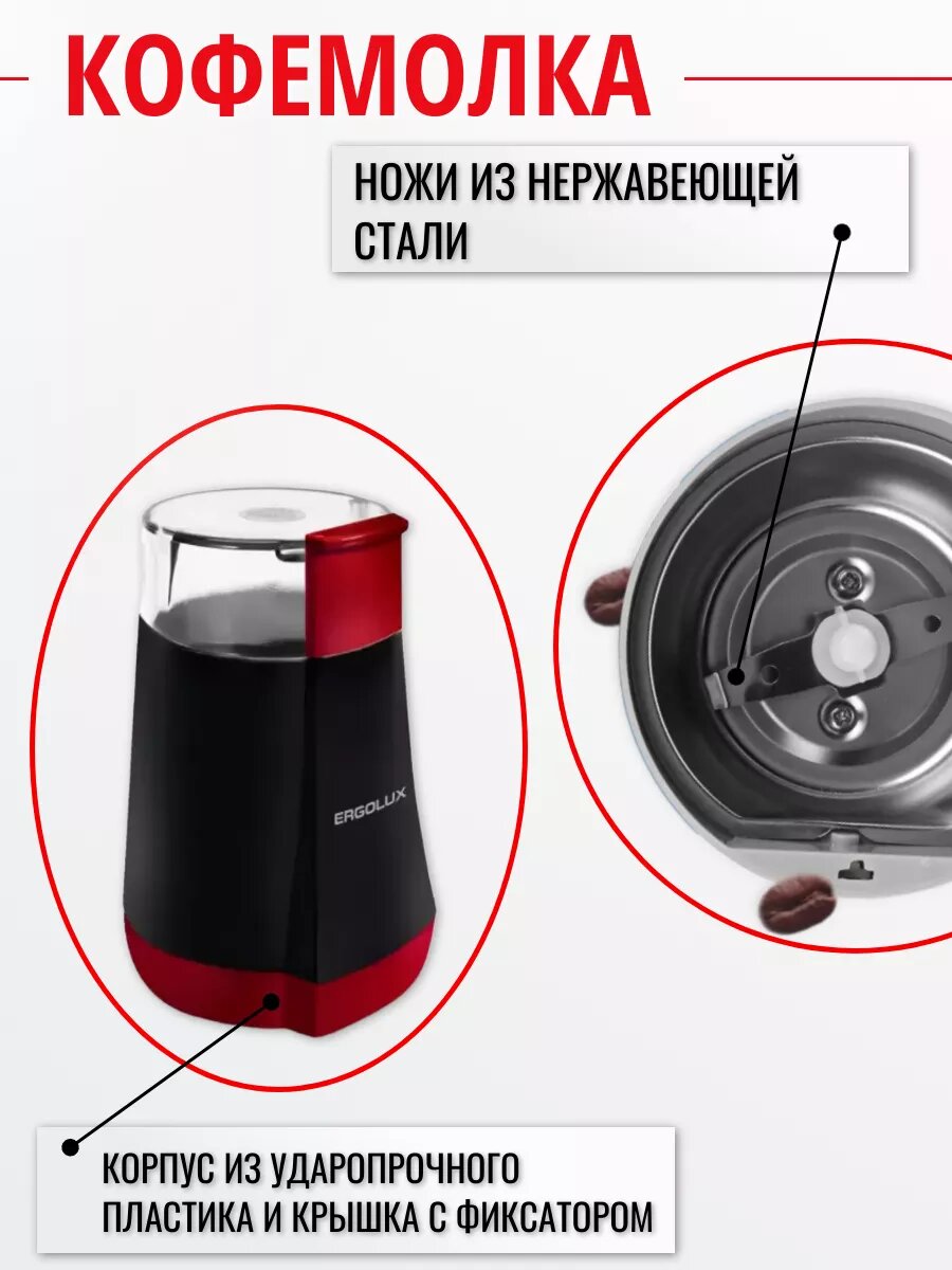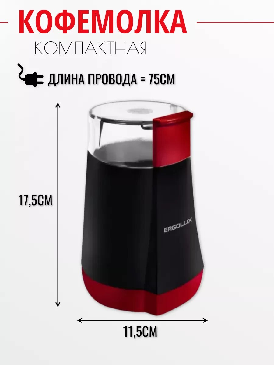 Купить Кофемолка ERGOLUX ELX-CG02-С43 130Вт, нож и чаша - нерж.сталь, черный/красный