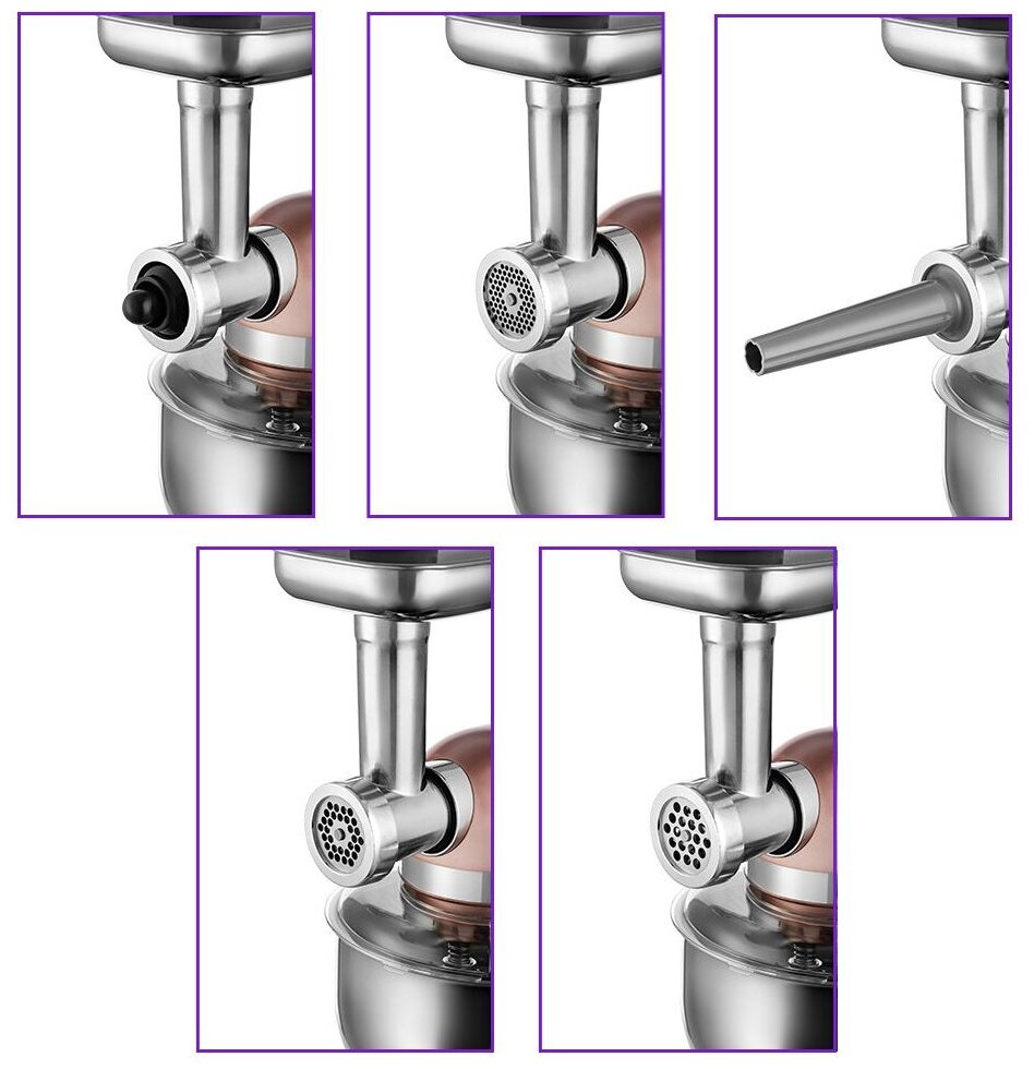 | Дополнительная информация | Комплектация 1. Моторный блок — 1 шт. 2. Чаша миксера — 1 шт. 3. Крышка чаши миксера — 1 шт. 4. Венчик для взбивания — 1 шт. 5. Насадка для смешивания — 1 шт. 6. Крюк для замешивания теста — 2 шт. (маленький + большой) 7. Мясорубка — 1 компл.: • Загрузочный блок мясорубки — 1 шт. • Кольцевая гайка мясорубки — 1 шт. • Загрузочный лоток — 1 шт. • Толкатель — 1 шт. • Шнек — 1 шт. • Нож — 1 шт. • Решетка с мелкими отверстиями (3 мм) — 1 шт. • Решетка со средними отверстиями (5 мм) — 1 шт. • Решетка с крупными отверстиями (7 мм) — 1 шт. • Насадка для колбас 1 — 1 шт. • Насадка для колбас 2 — 1 шт. • Насадка для кеббе — 1 шт. • Крышка насадки для кеббе — 1 шт. • Насадка для печенья — 1 шт. • Насадка для спагетти — 1 шт. • Насадка для макарон — 1 шт. • Насадка для тальятелле — 1 шт. 8. Терка — 1 компл.: • Загрузочный блок терки— 1 шт. • Кольцевая гайка терки — 1 шт. • Толкатель — 1 шт. • Терка (нож) — 1 шт. • Шинковка (нож) — 1 шт. 9. Руководство по эксплуатации — 1 шт. 10. Коллекционный магнит — 1 шт.* *опционально |