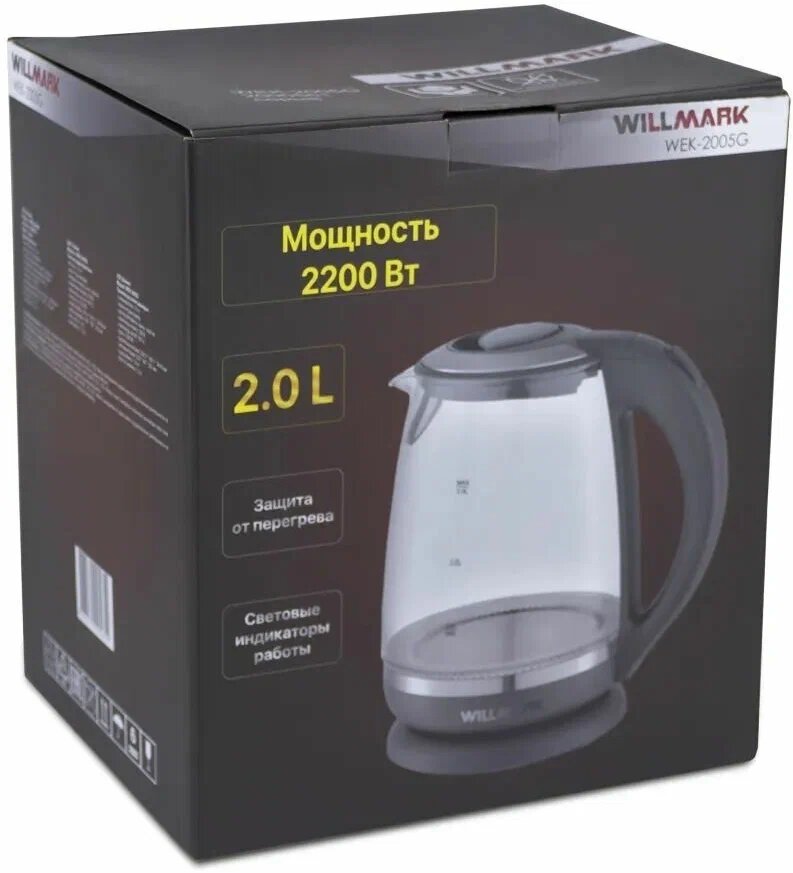 Чайник электрический WILLMARK WEK-2005G 2 л, 2.2 кВт, стекло, серый