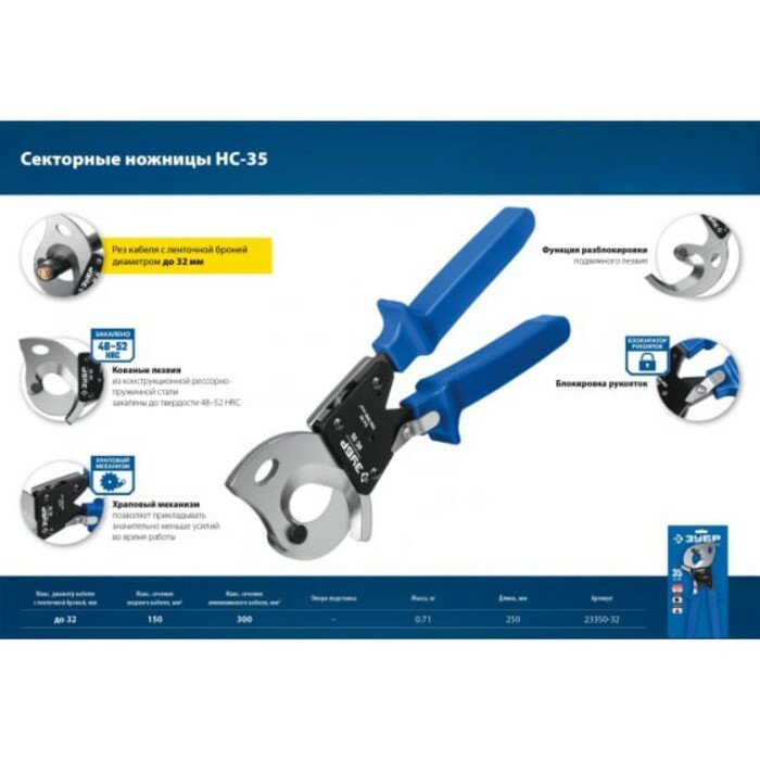 Секторные ножницы ЗУБР НС-35 32 мм (Cu -150 mm2, Al-240 мм2), 250 мм, 23350-32. Серия Профессионал