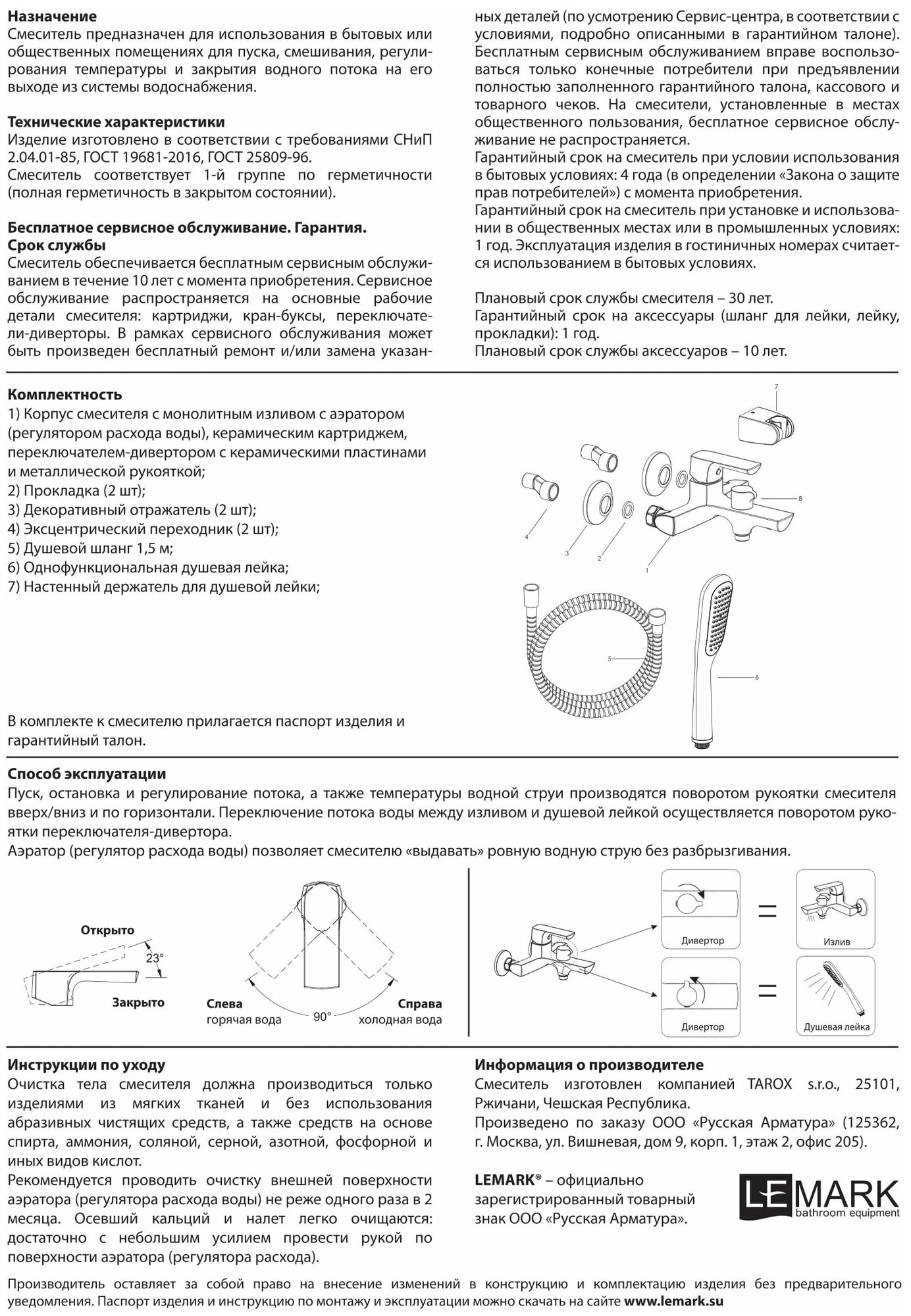 | Комплектация | 1. Смеситель для ванной - 1шт. / 2. Ручной душ - 1 шт. / 3. Держатель для душа - 1 шт., |