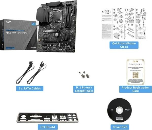 | Комплектация | -материнская плата MSI PRO Z690-P DDR4; -кабель SATA 2 шт; -винты для M.2 SSD; -заглушка портов ввода/вывода; -диск с драйверами и ПО; -документация. |