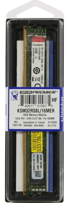 Модуль памяти KINGSTON 16ГБ DIMM, ECC, registered, PC4-25600, CL22, 3200МГц (KSM32RS8L/16MER)