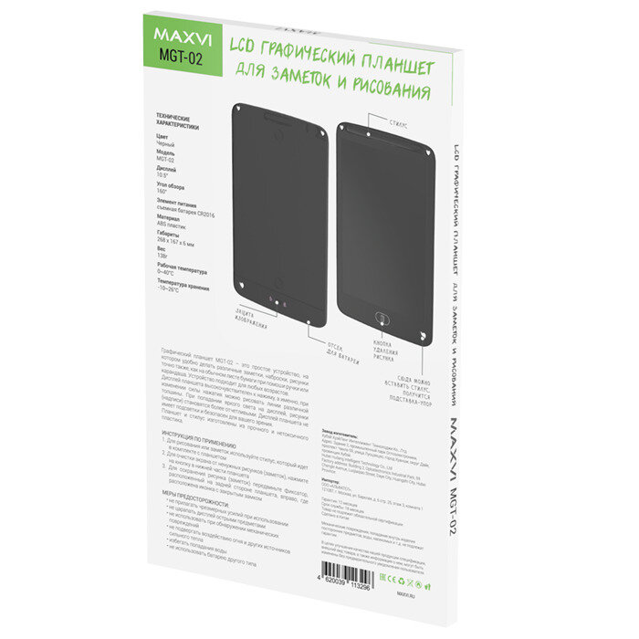 LCD графический планшет для заметок Maxvi MGT-01, черный, 8.5", монохромный