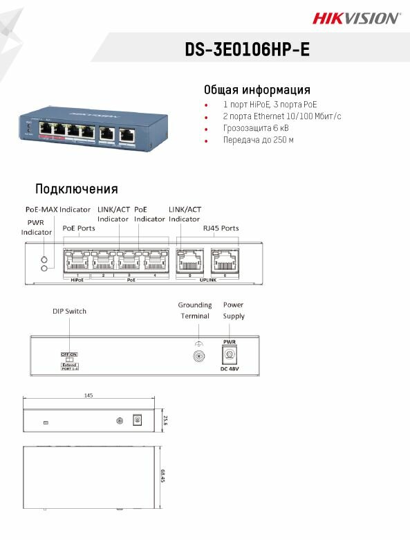 Hikvision DS-3E0106HP-E, Неуправляемый коммутатор (свитч)
