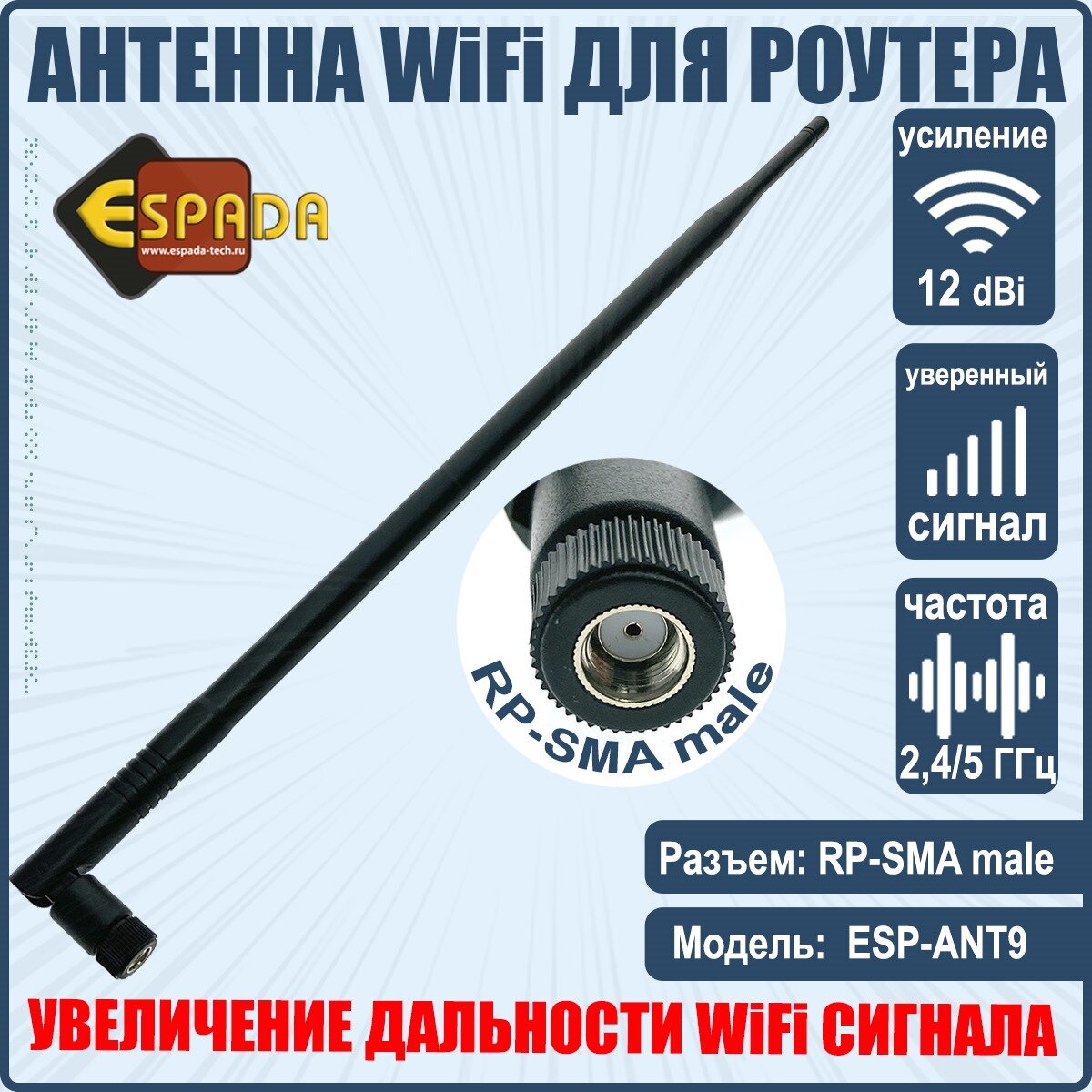 Антенна 2,4/5G WiFi для беспроводных устройств, RP-SMA male, усиление 12 dbi, модель ESP-ANT9, Espada