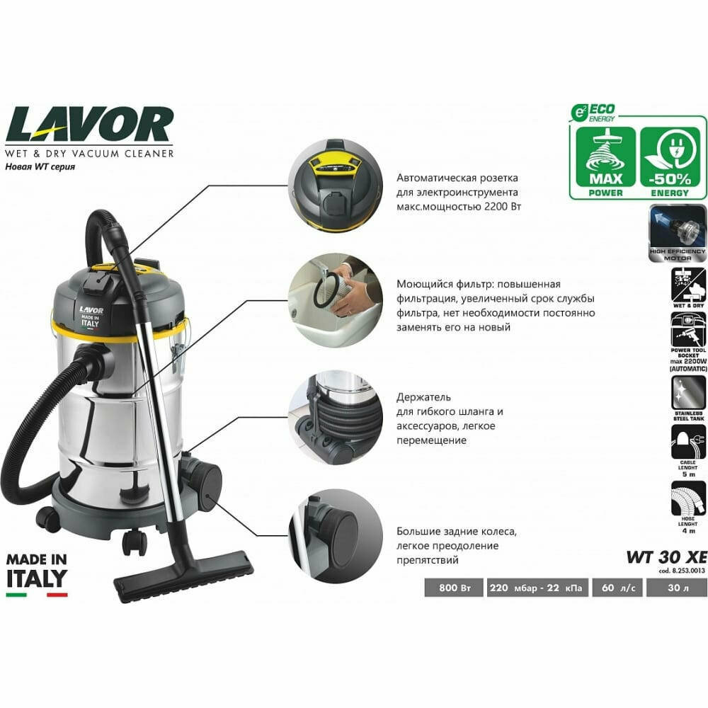 Электрический бытовой пылеводосос Lavor WT 30 XE с розеткой для электроинструмента 8.253.0013