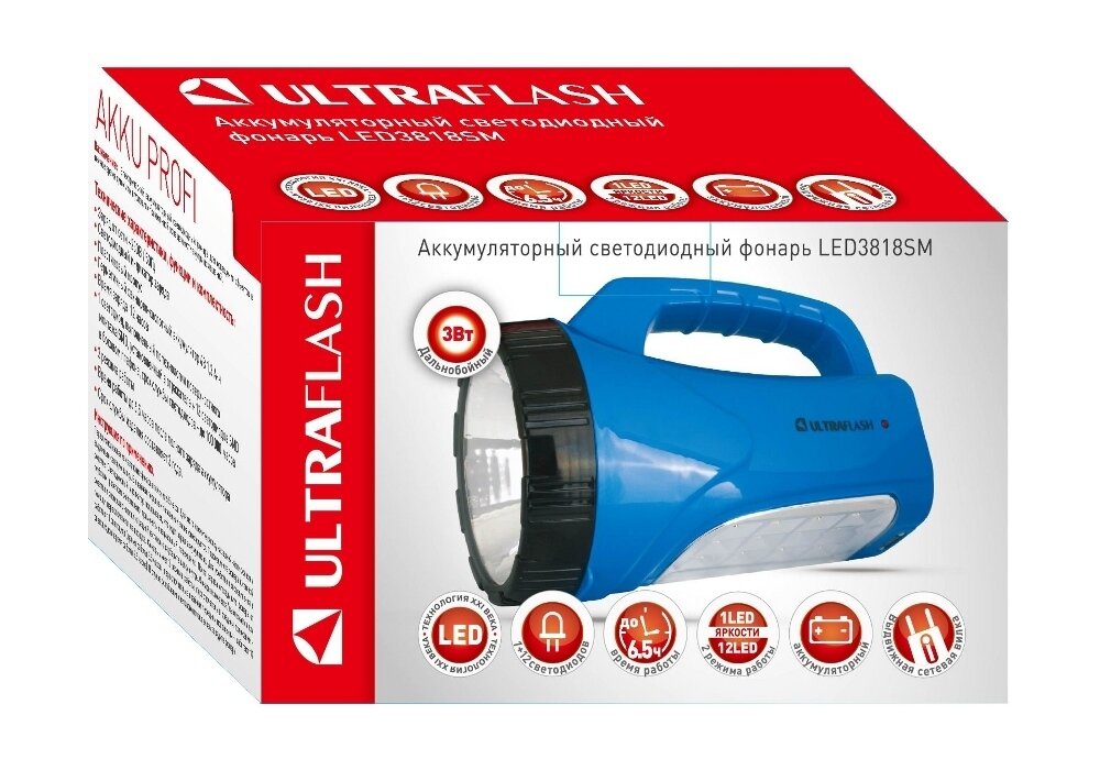 Купить Ultraflash LED3818SM (фонарь аккум. 220В, синий, 3W LED+12SMD LED, 2 реж., SLA, пласт, коробка)