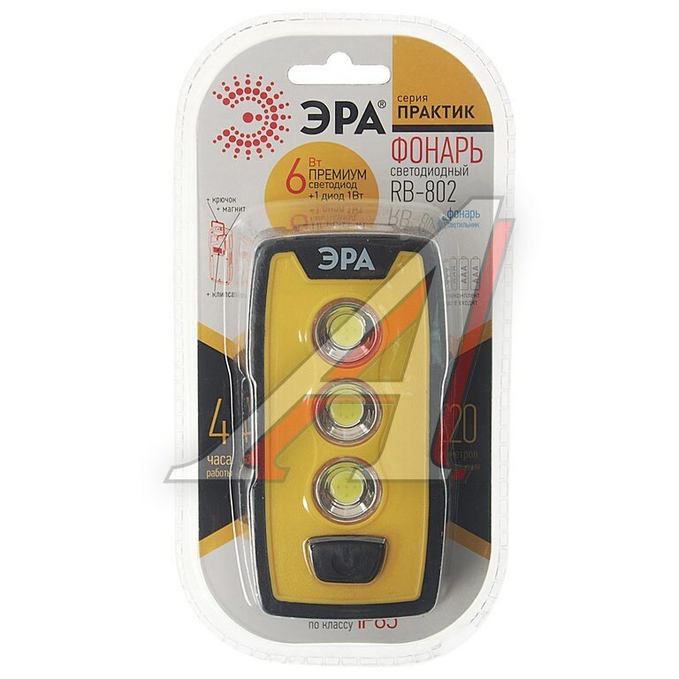 ЭРА Б0029180 Рабочий фонарь RB-802 серия "Практик" {6Вт COB светодиод, светильник 4Вт, 3xAAA в комплект не входят, крючок, магнит, клипса-прищепка}