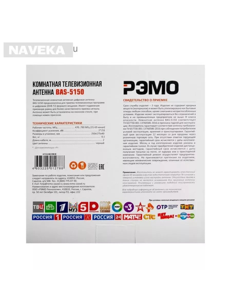 Антенна"РЭМО" BAS-5150-DX, комнатная, активная, 33 дБи, 5В, DVB-T, DVB-T2, цифровая РЭМО 4994528 .