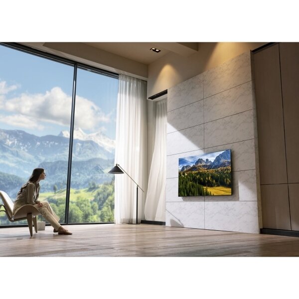 Хороший звук Разместился на стене (подвесили) и практически не занимает места по сравнению с предыдущим на подставке, пространства в комнате стало больше, хоть он сам по себе в размерах огромный. Удобный пульт: есть встроенное колесо прокрутки как у мыши, и также можно им как указкой управлять курсором |