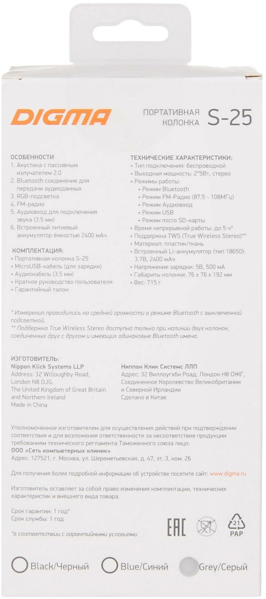 Портативная акустика DIGMA S-25, серый