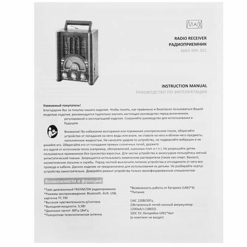 Радиоприёмник MAX MR 351/Радио/ Bluetooth, AM/FM/SW ,USB интересное: