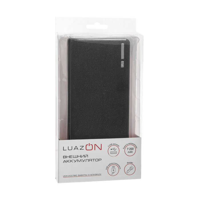 Внешний аккумулятор Luazon PB-01, 7200 мАч, 2 USB, 1/2.1 А, фонарик, чёрный