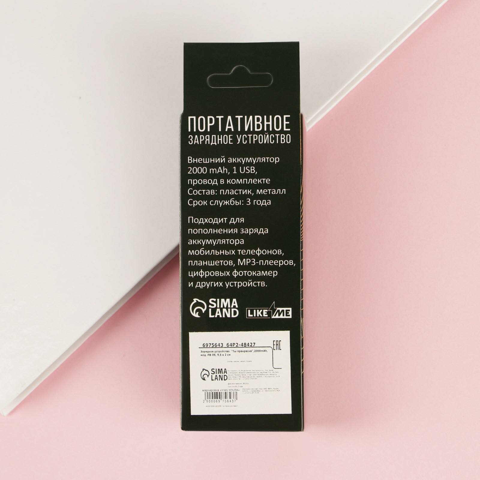 Портативный аккумулятор "Ты прекрасна",2000mAh, мод. PB-06, 9,5 х 2 см интересное: