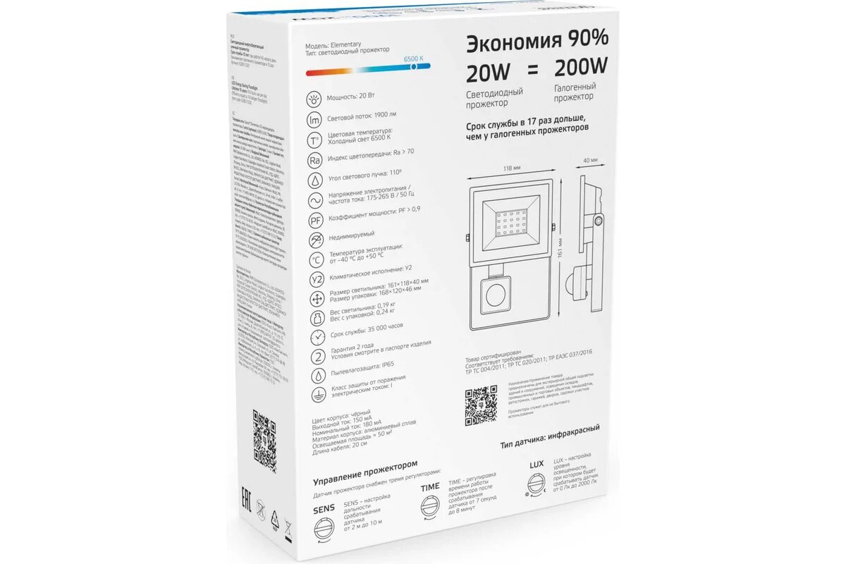 Прожектор светодиодный с датчиком движения gauss Elementary-S 628511320, 20 Вт, свет: холодный белый