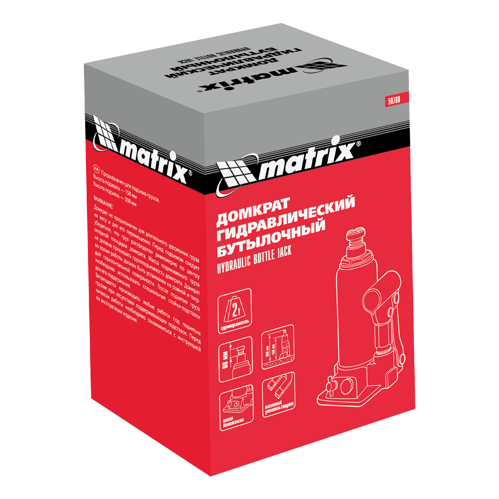 MATRIX 50760 Домкрат гидравлический бутылочный, 2 т, h подъема 158-308 мм MATRIX 50760 MATRIX 50760