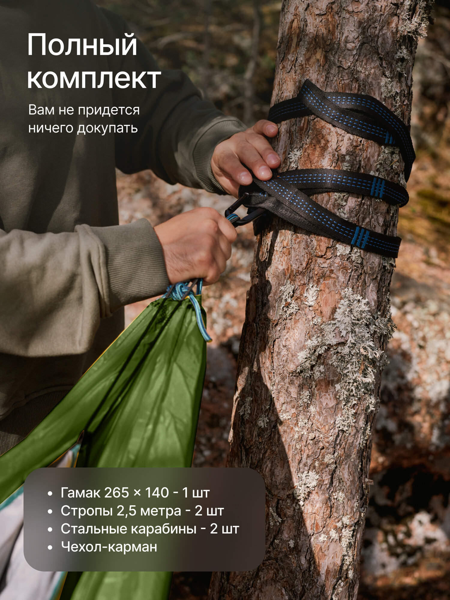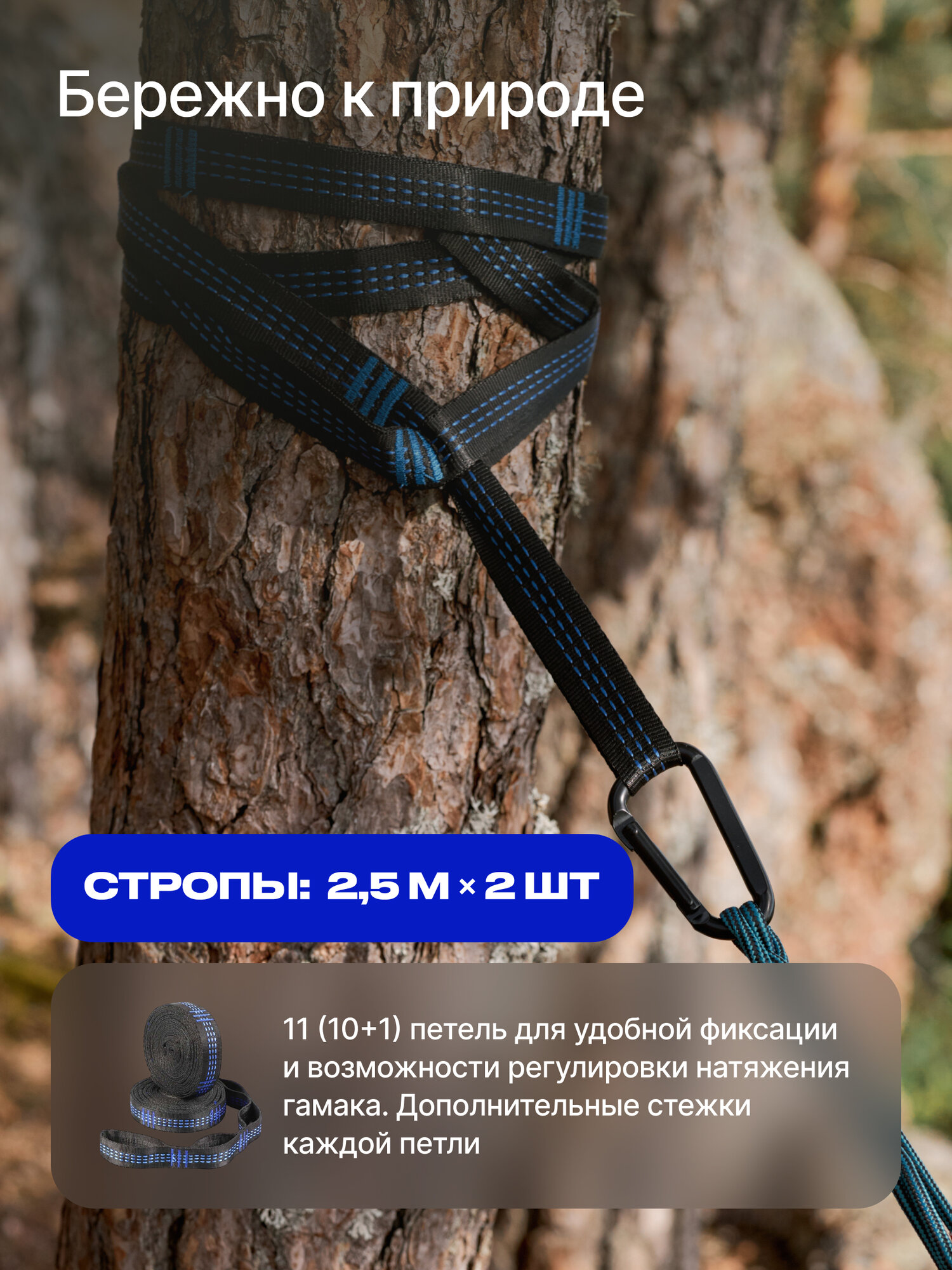 | Плюсы: | Удобный, компактный, прочные простроченные крепления-ленты (не надо вязать узлов, чтобы отрегулировать гамак по длине/высоте), хорошие металлические карабины |