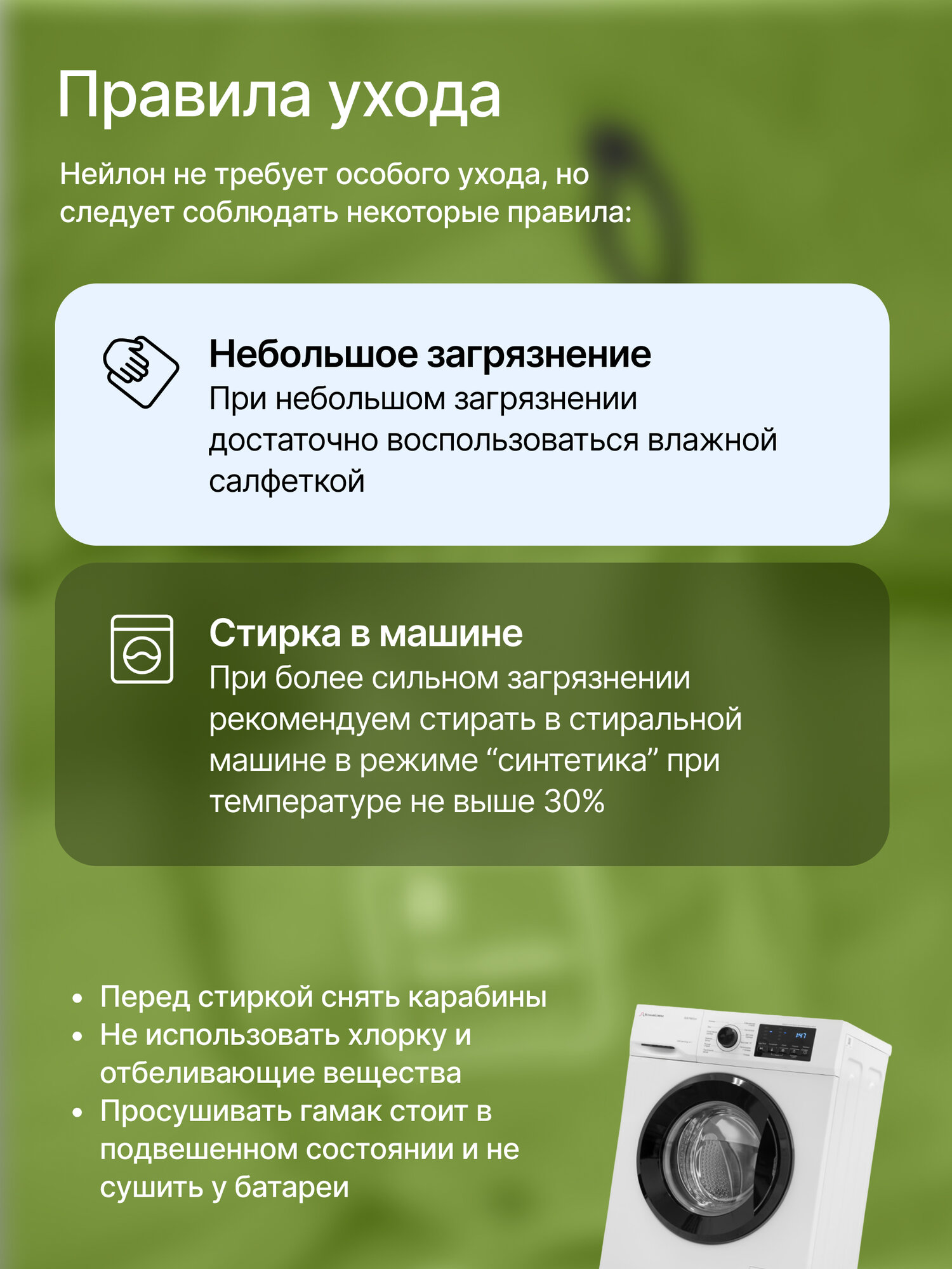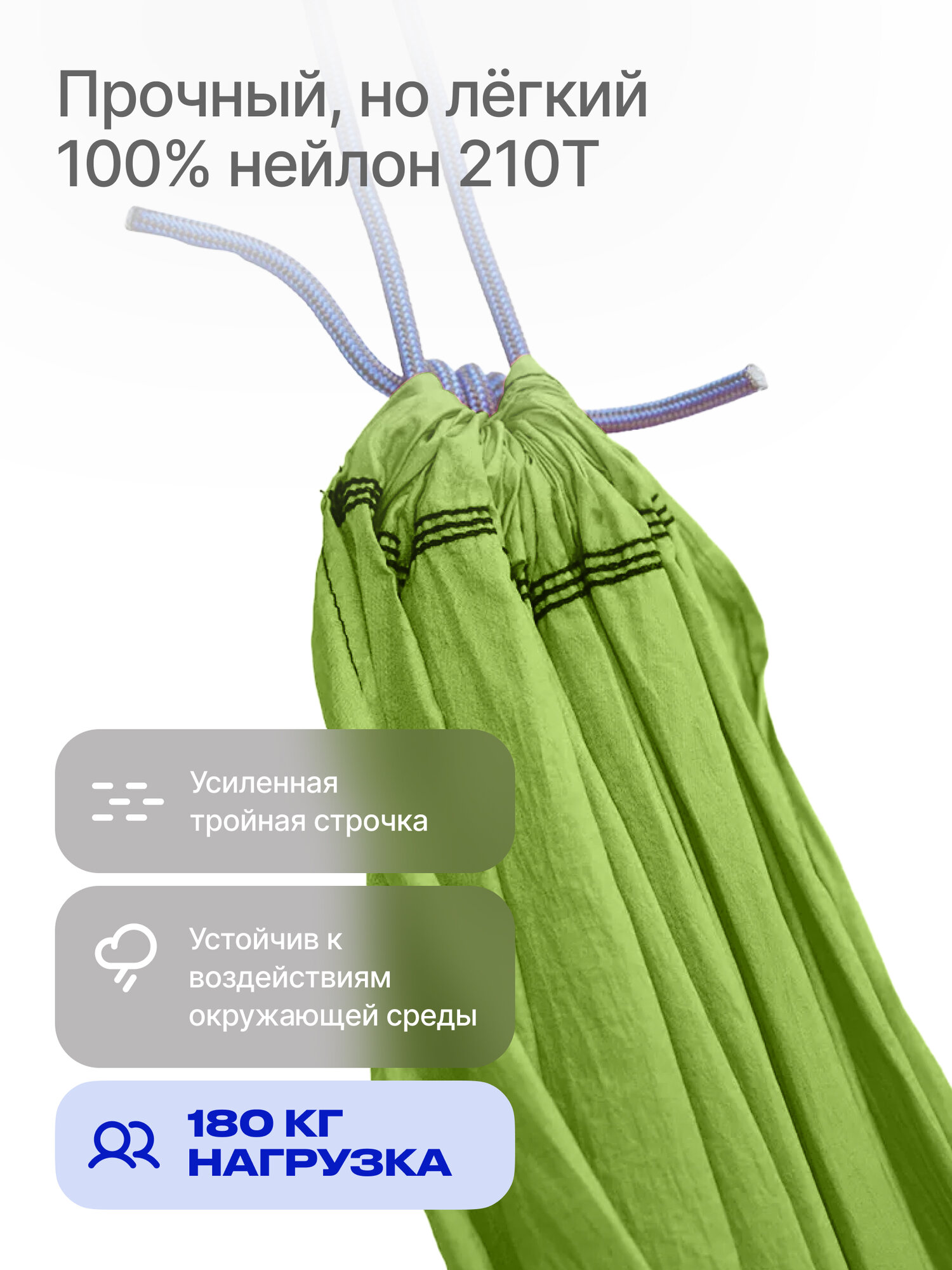 | Плюсы: | Гамак прочный, порадовал, выдержал нагрузку 90 кг моего мужа без проблем. Материал нейлоновый, сохнет быстро. Цвет яркий, насыщенный, бросается в глаза. |