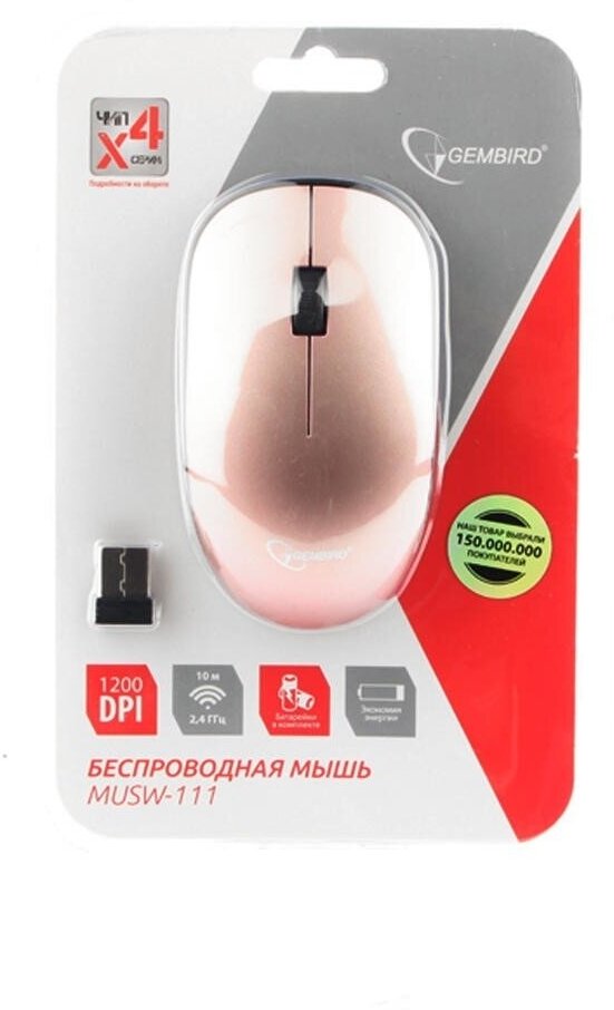 Мышь Gembird MUSW-111-RG, беспроводная,оптическая, 1200 dpi, 1xAA, USB, цвет розовое золото Gembird .