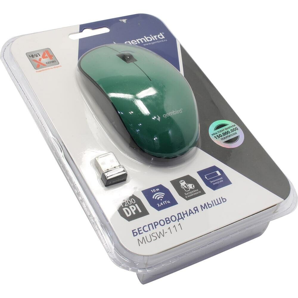 Мышь Gembird MUSW-111-GRN, беспроводная, оптическая, 1200 dpi, 2.4 ГГц, 1xAA, USB, зелёная Gembird 4