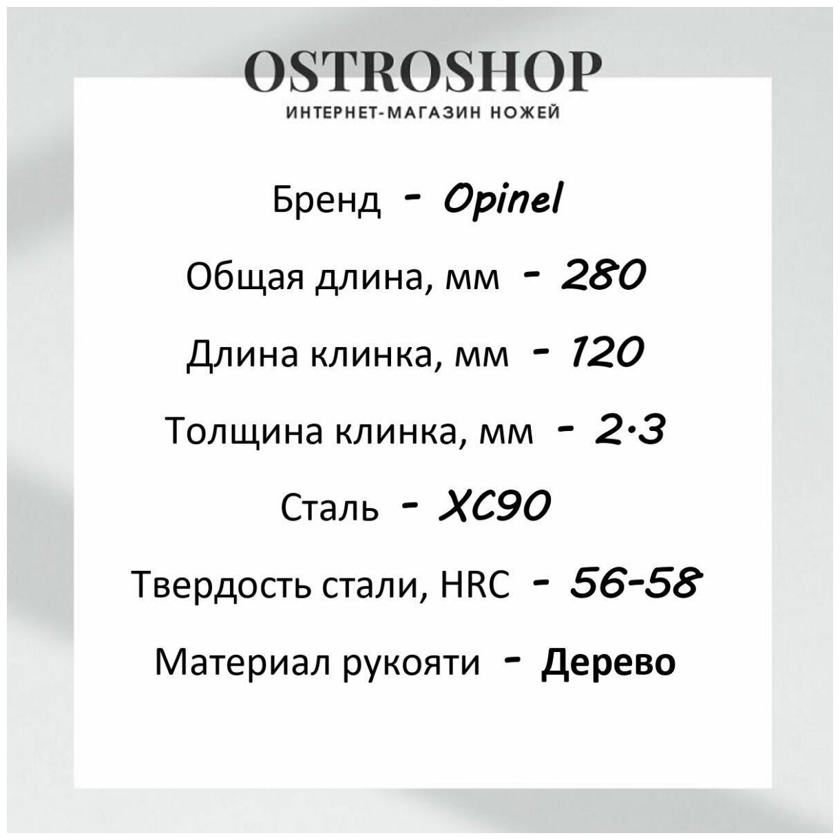 | Плюсы: | Польщен прекрасной резучестью этого великана опинелей, толщина обуха здесь тоже заметно шире, это позволяет ставить ему задачи несколько выше чем для меньших его собратьев. Но это по прежнему остаётся походно-продуктовым ножом. Требует внимательного отношения к клинку и платит хорошей остротой. |