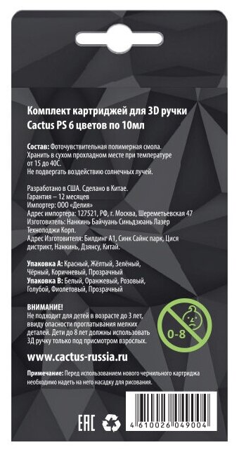 Пластик для ручки 3D Cactus Cs-3d-uvps-b УФ-полимер 6цв. Cs-3d-uvps-b интересное: