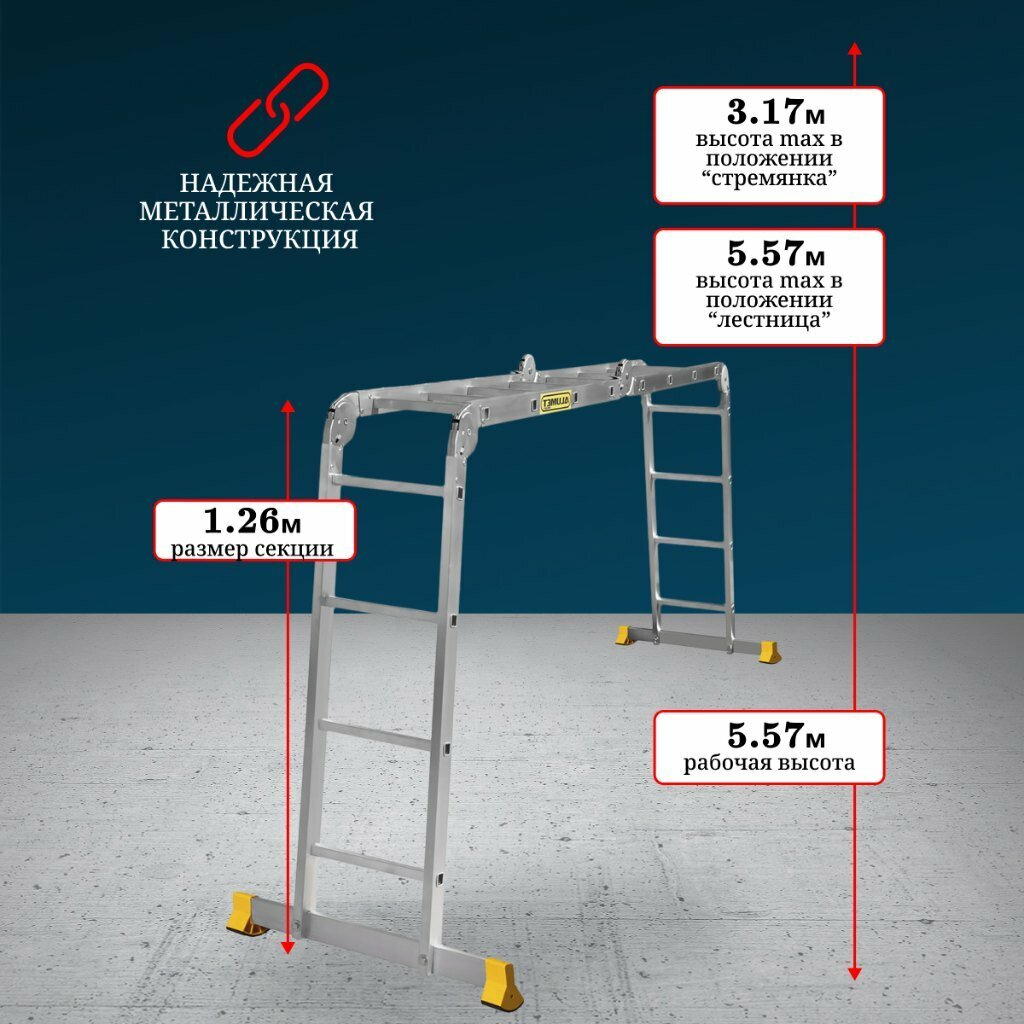 Новая высота Лестница-трансформер 3-х секционная 3×7 ступеней, 3×1,9 м, высота 4,5 м, нагрузка 150 кг, алюминий, новая высота