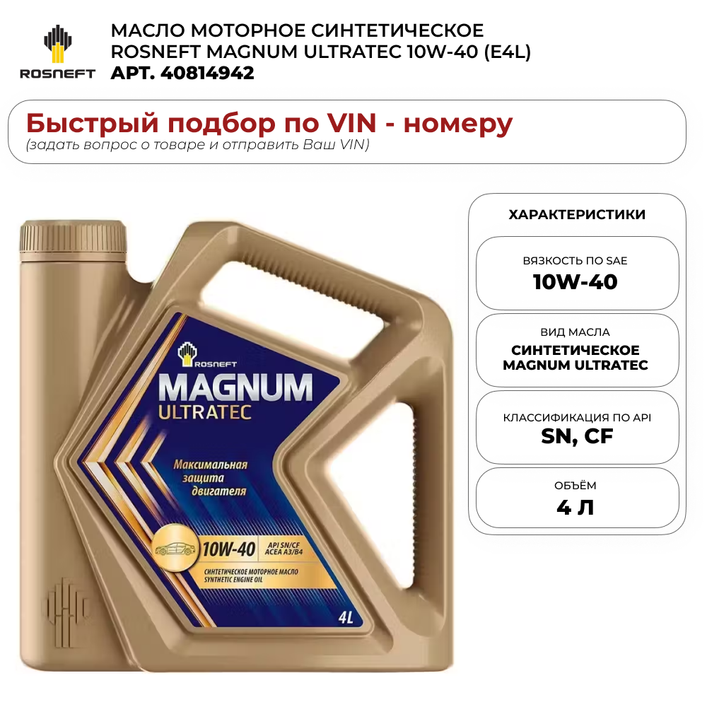 масло rosneft rn magnum ultratec sn/cf 10w40 4л синтетическое моторное