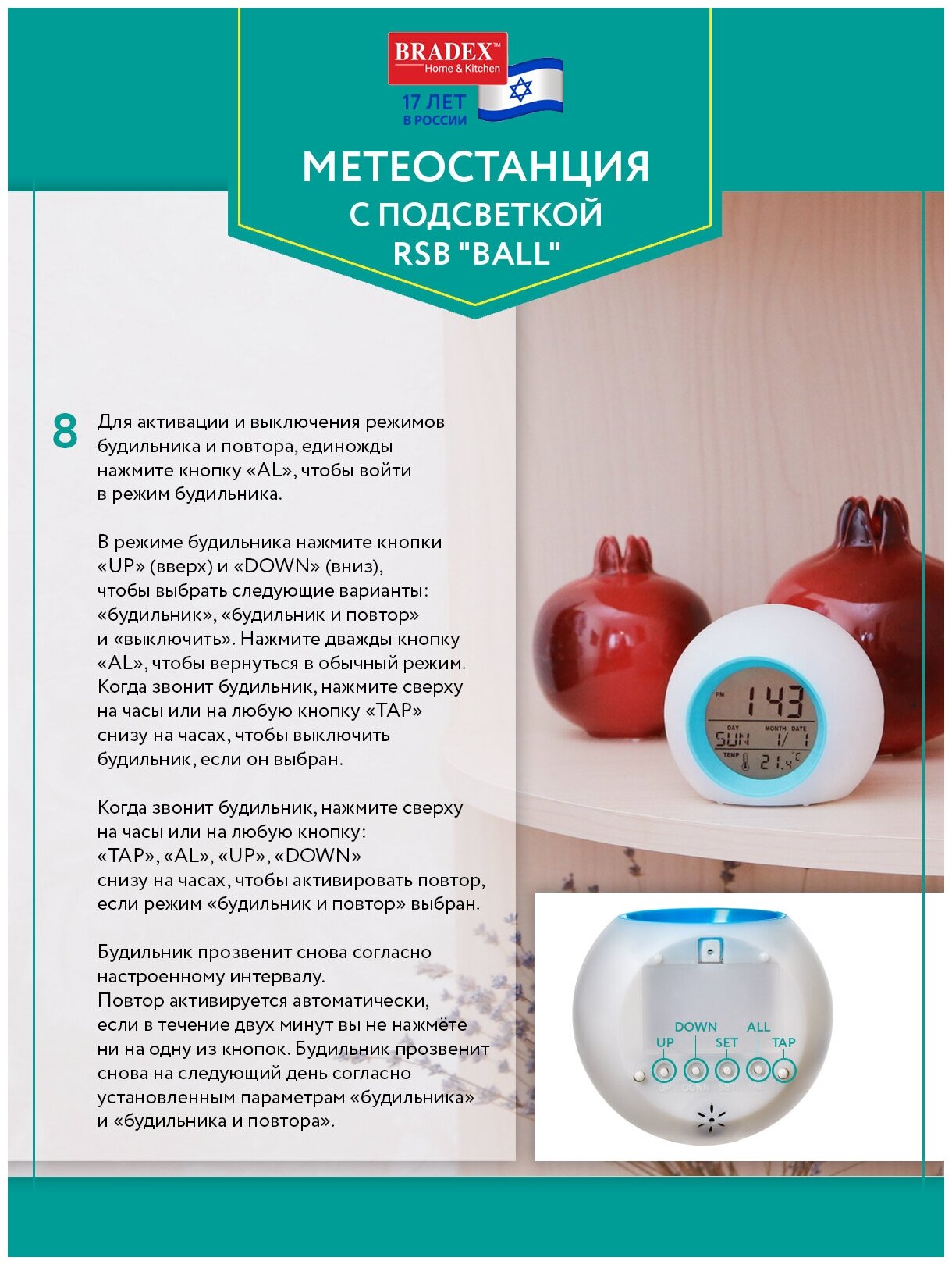 Метеостанция с подсветкой BRADEX RSB "BALL" 8,5x8,5x8см, белый