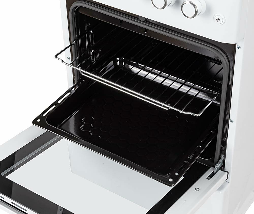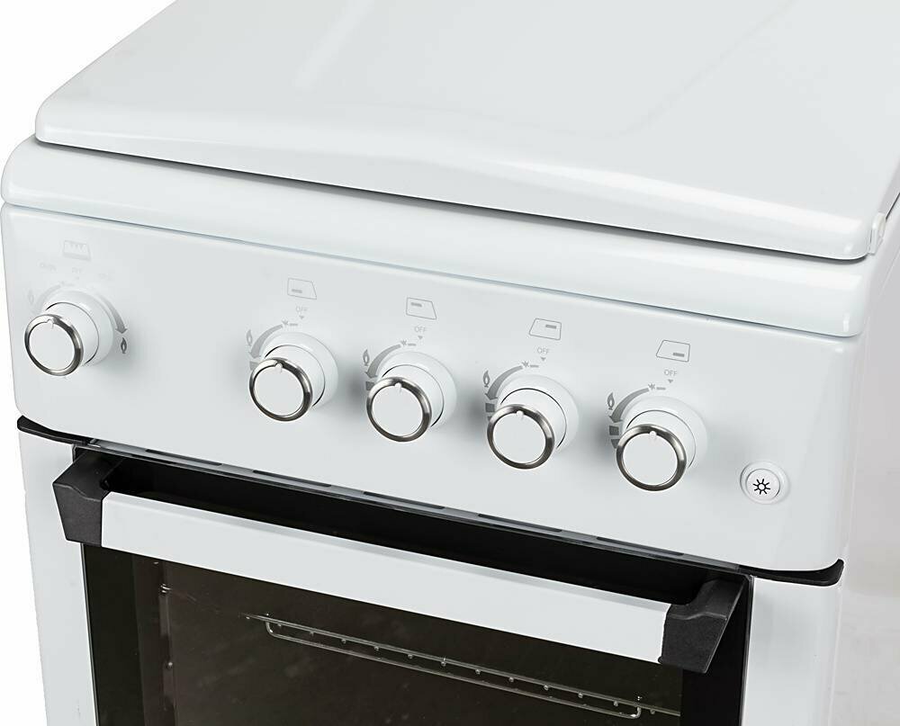 | Плюсы: | Яркое освещение духового шкафа; классическое управление; розжиг электро по кнопке на конфорках. |