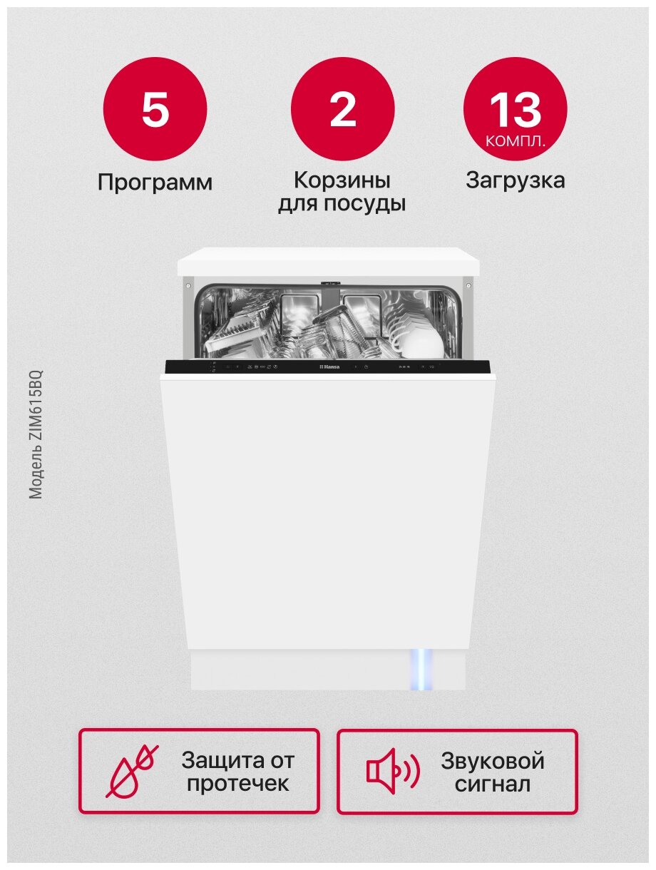 Встраиваемая посудомоечная машина 60 см Hansa ZIM615BQ, с защитой от протечек, 5 программ, с 2 корзинами, с режимом половинной загрузки, с сигналом "луч на полу"