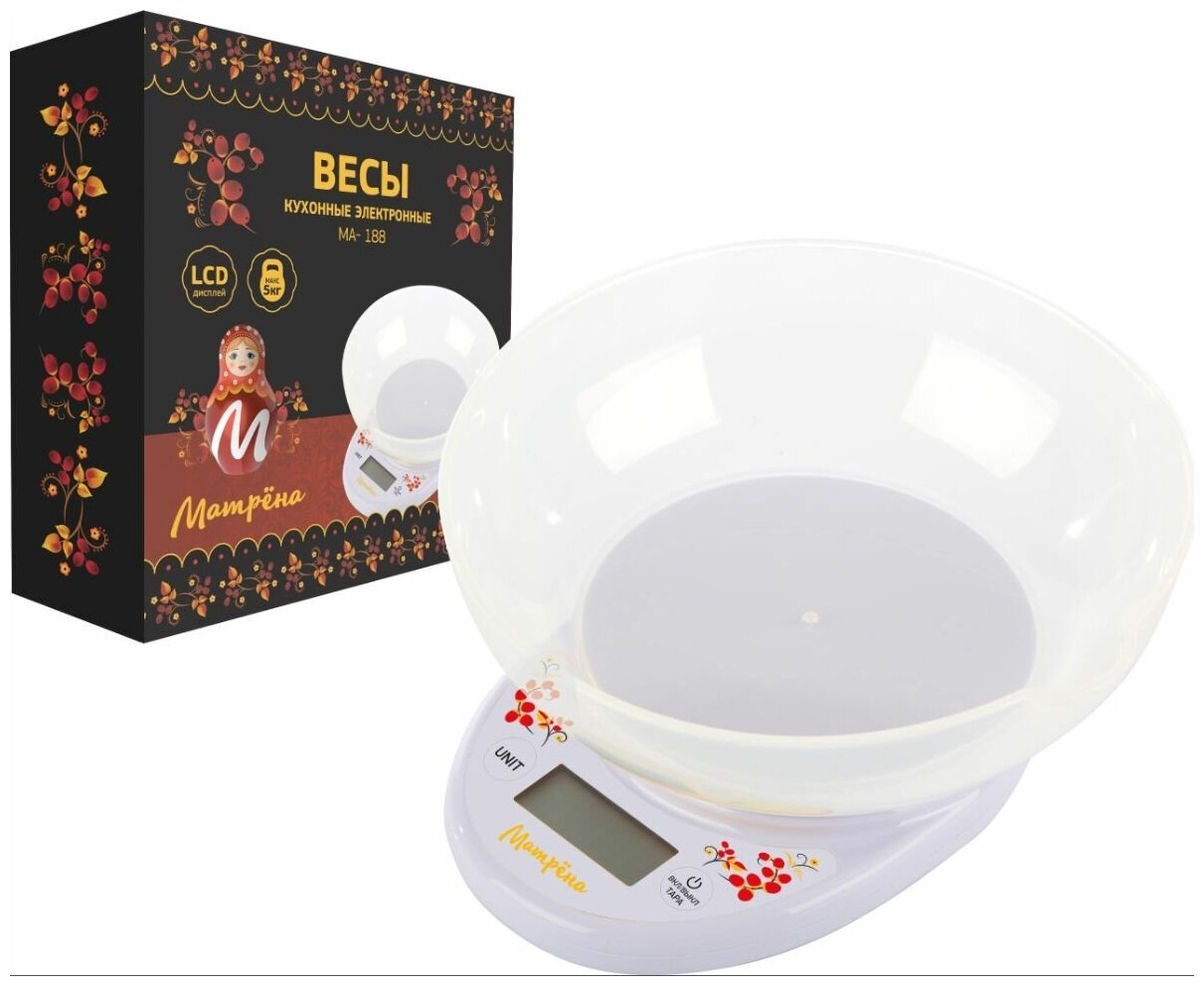 Весы кухонные Матрёна МА-188 007936 электронные, с чашей 800мл, пластик, белый, нагрузка до 5кг / для взвешивания продуктов / техника для кухни