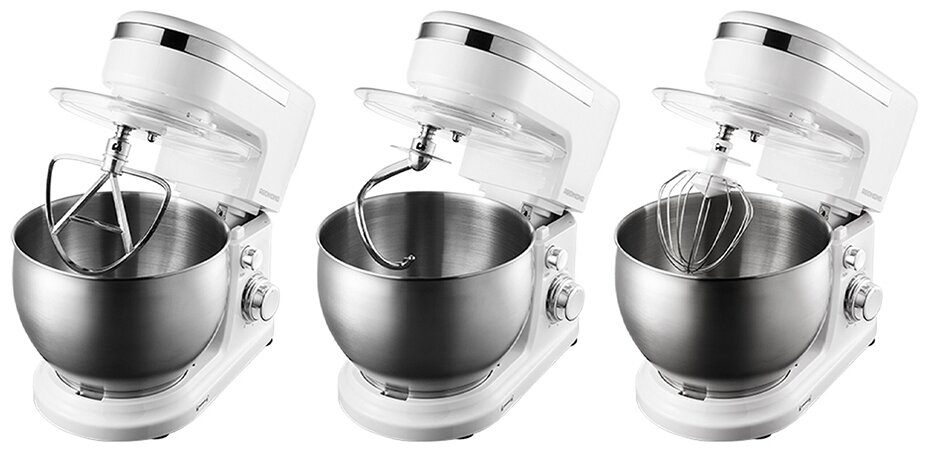 У него 6 скоростей, можно выбрать оптимальную скорость для различных видов заготовок. Есть функция плавного пуска и стоп-механизм - безопасно и удобно. Благодаря планетарному движению насадок, ингредиенты мешаются равномерно, достигая идеальной консистенции. Насадки легко сменяются, а мощный мотор гарантирует эффективную работу даже с тяжелым тестом.