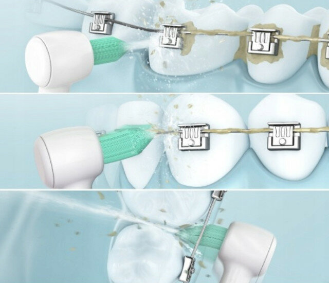 | Плюсы: | Удобство и простота, очистка полости рта без использования пасты, деликатное удаление остатков пищи между зубами. Можно для тех, у кого брекеты. |