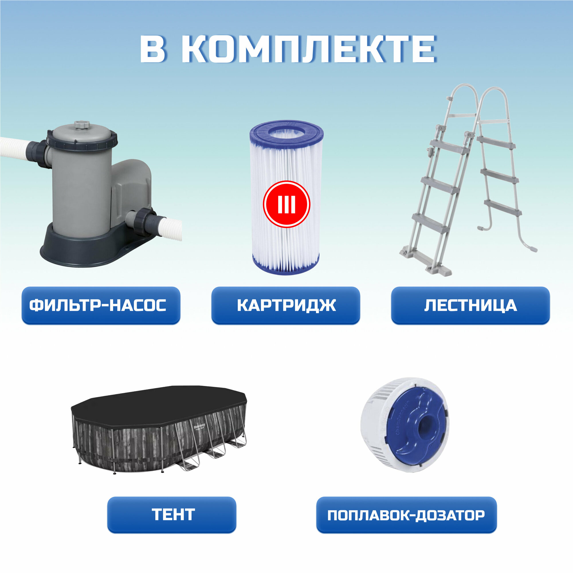 Бассейн каркасный Bestway, 610х366х122 см, Power Steel Oval Pool, 5611R, фильтр-насос, лестница, тент, 20241 л, поплавок-дозатор