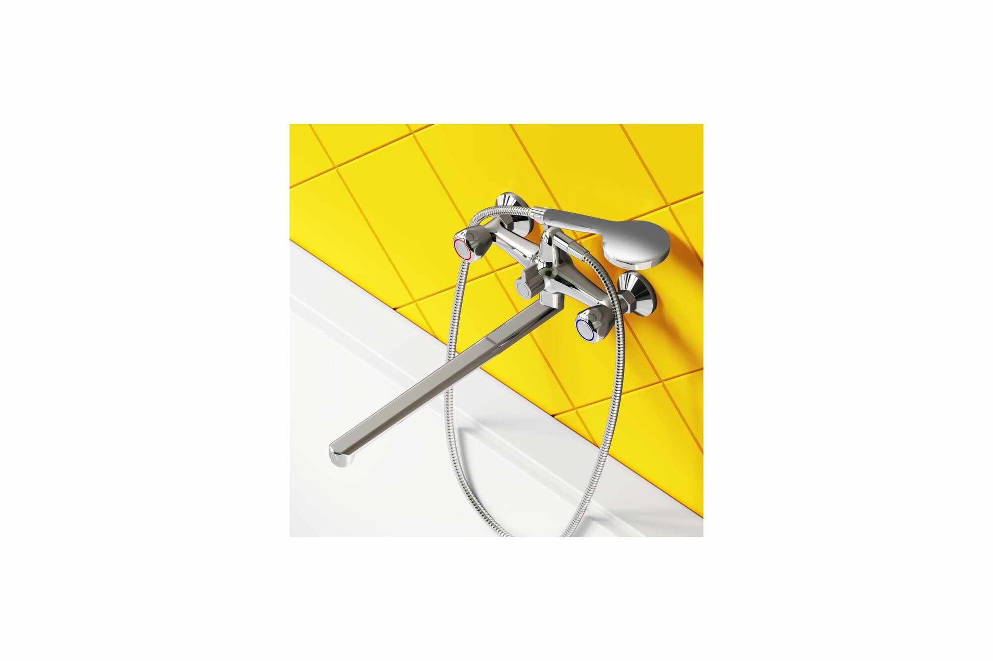 | Комплектация | смеситель - 1 шт. / эксцентрики 3/4" на 1/2" - 2 шт. / декоративные металлические чашки - 2 шт. / душевая лейка со шлангом (150 см) - 1 шт. |